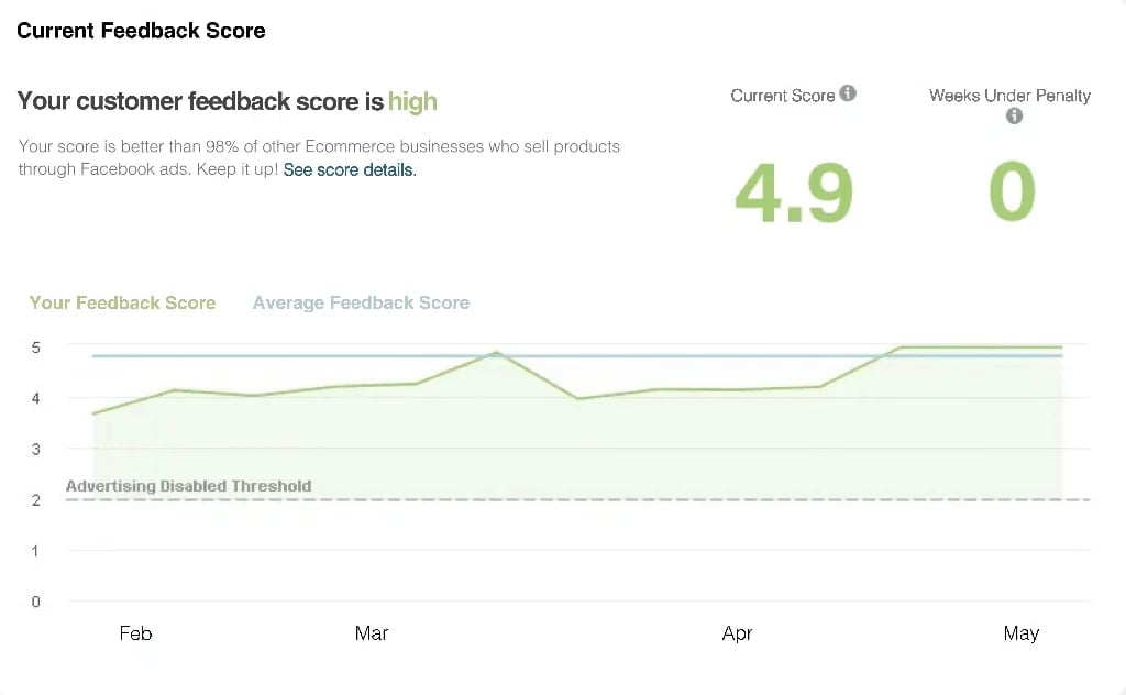 Our Facebook Official Customer Feedback Score Has Reached 4.9 out of 5. The score is better than 98% of other Ecommerce businesses who sell products through Facebook ads