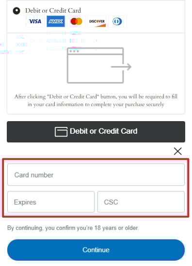 If you want to checkout with a Debit or Credit Card, just enter your Card number, Expires and CSC.
